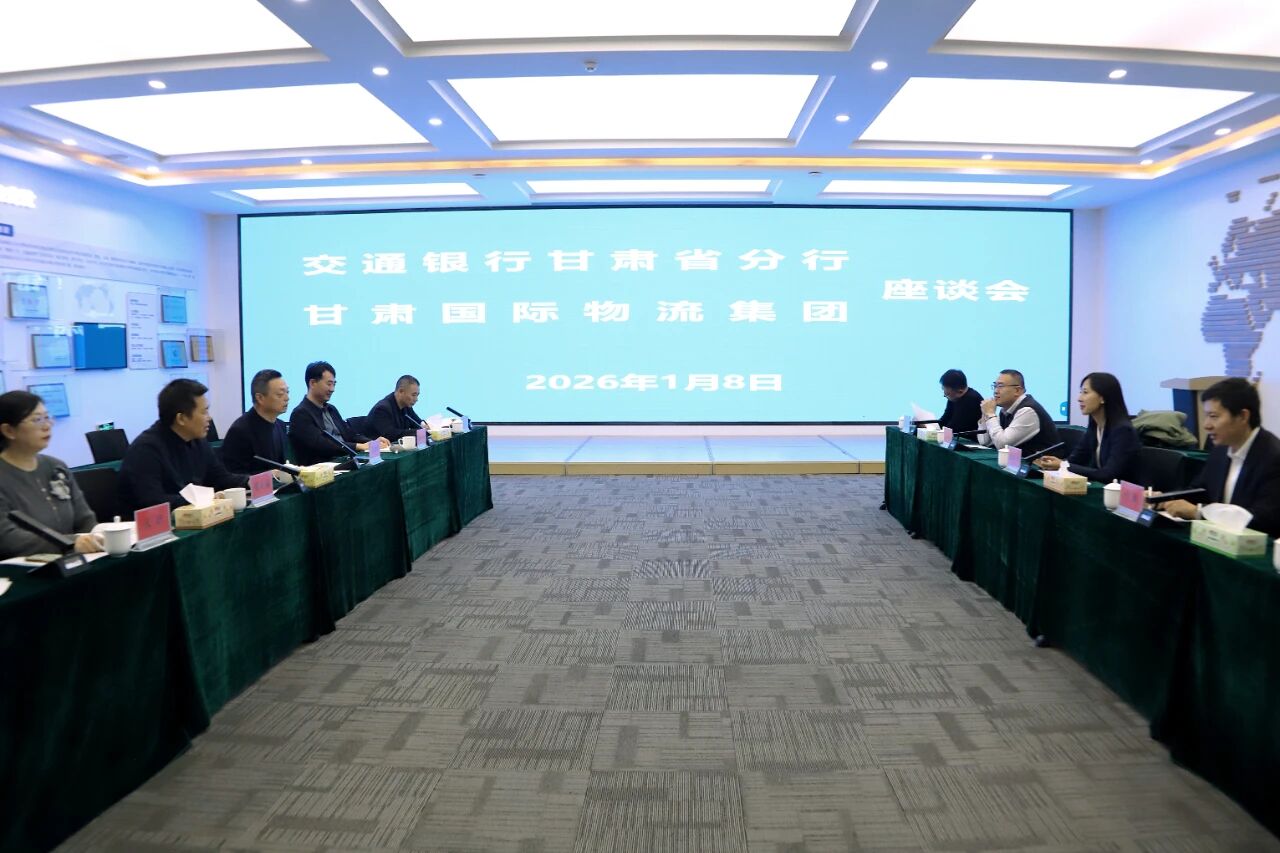 1月8日,交通銀行甘肅省分行黨委書記、行長張曉華一行到訪甘肅國際物流集團(tuán),雙方聚焦金融賦能物流產(chǎn)業(yè)發(fā)展、深化銀企深度合作路徑進(jìn)行了座談。集團(tuán)公司黨委書記、董事長張鐵強(qiáng)出席會議并主持座談。