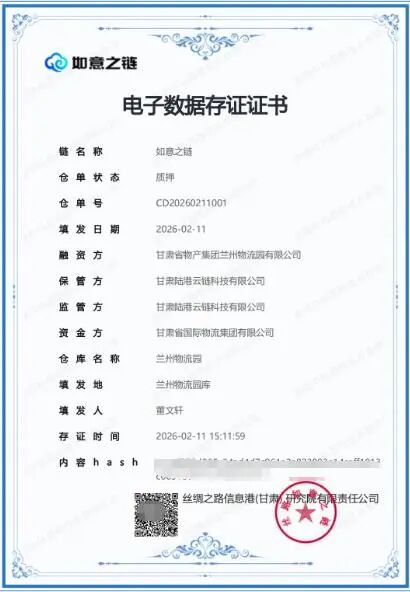 此次業(yè)務全程依托集團公司所屬陸港云鏈公司開發(fā)的“甘肅港口信息一體化平臺”線上操作,通過貨物數字化監(jiān)管、數據實時聯通,將傳統(tǒng)紙質倉單升級為不可篡改、可追溯的電子憑證,并對接“如意之鏈”區(qū)塊鏈平臺,實現倉單生成、質押等全流程存證,大幅提升倉儲與融資的透明度和安全性。